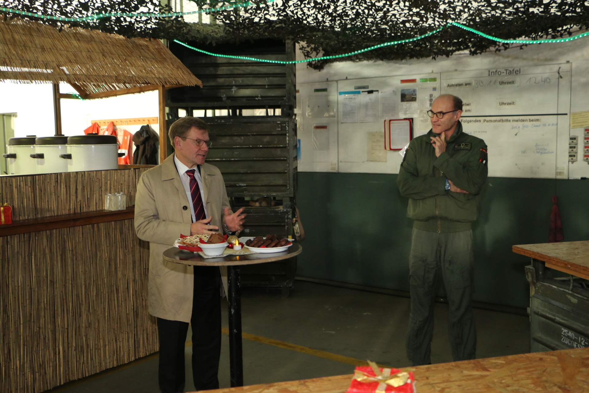 Eine weite Reise hatte die Nordmanntanne aus dem kleinvollstedter Forst von Claus Ehlers vor sich: 5.000 Km bis ins afrikanische Niger ging es für sie. Gemeinsam mit dem Kreisbauernverband spendet die CDU Rendsburg-Eckernförde seit vielen Jahren Weihnachtsbäume für unsere Soldaten. „Eine schöne Tradition“, findet der Kommodore des Lufttransportgeschwaders 63 (LTG63), Hartmut Zitzewitz. In diesem Jahr wird eine der Nordmanntannen vor dem Offiziersheim im Standort Krummenort aufgestellt und die andere wird ihren Platz im Lager LTG63 im afrikanischen Niger finden. Dort wird sie den 20 Soldaten des LTGs bei fast 40 Grad ein wenig Weihnachtsgefühle bereiten, die den Lufttransport für die Mali Mission bestreiten. Johann Wadephul und Hans Neve verluden die Tanne gemeinsam mit den Bauernverbandsvertretern Klaus-Peter Lucht und Eckard Clausen sowie dem Hohner Bürgermeister Jürgen Kuhrt höchstpersönlich in die bereitgestellt Transall C160. Schon am nächsten Tag startete diese zu ihrem über 5.000 Km langen Flug mit Zwischenlandung in Südspanien in den Niger. Johann Wadephul dankte den Soldaten für ihren Dienst und Klaus-Peter Lucht stellte heraus, wie wichtig es auch für die Bauern sei, dass unsere Soldaten für Sicherheit sorgten. Oberst Hartmut Zitzewitz freute sich: „Für uns ist das ein Zeichen Ihrer Verbundenheit mit uns!“