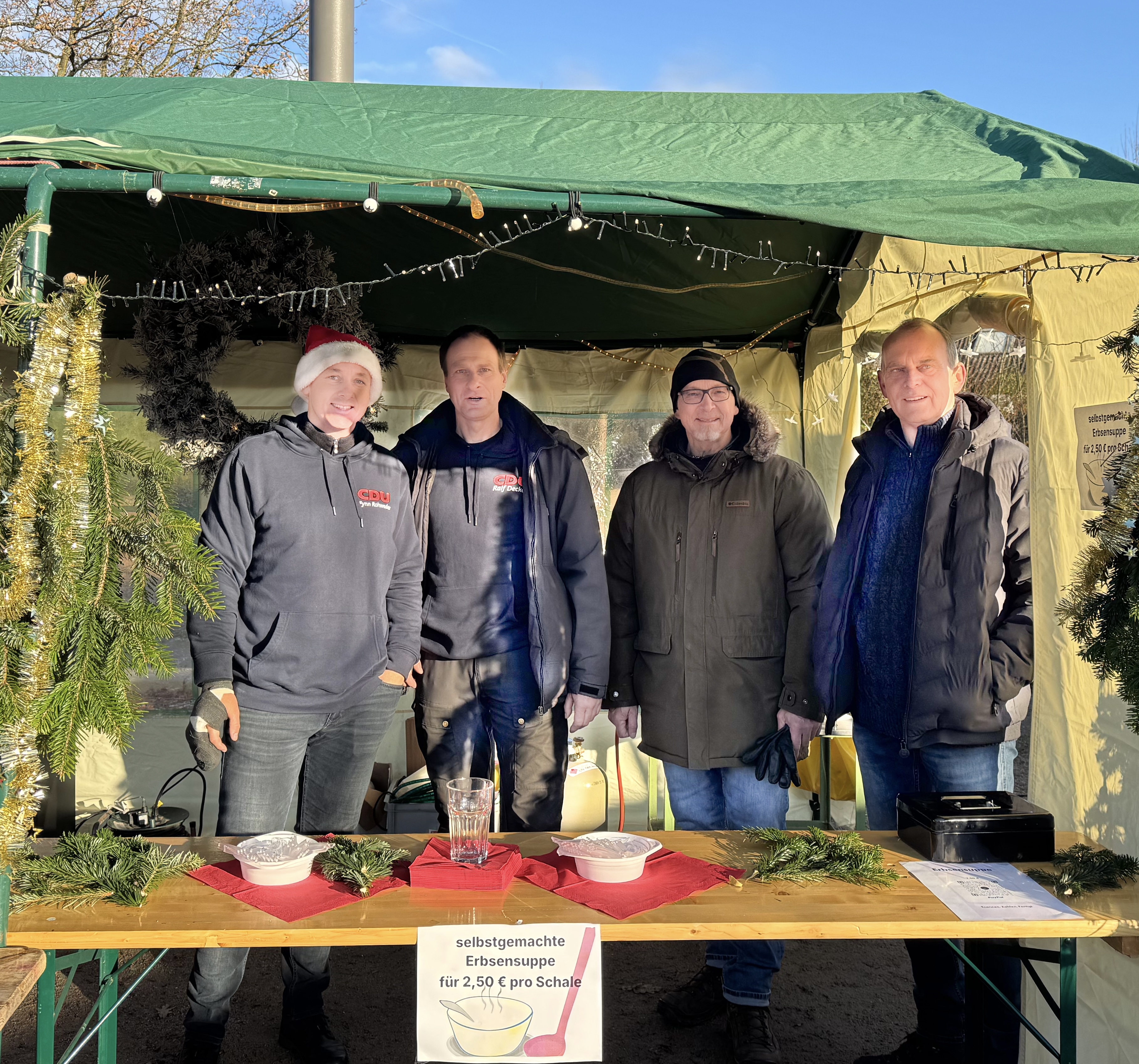 Am Sonntag, den 1. Advent 2024, hat der CDU-Ortsverband auf dem Schacht-Audorfer Weihnachtsmarkt selbstgemachte Erbsensuppe ausgegeben. Bei Kaiserwetter schmeckte die Suppe den Gästen scheinbar besonders gut, denn so war der große Topf mit 120 Portionen innerhalb kürzester Zeit leer.