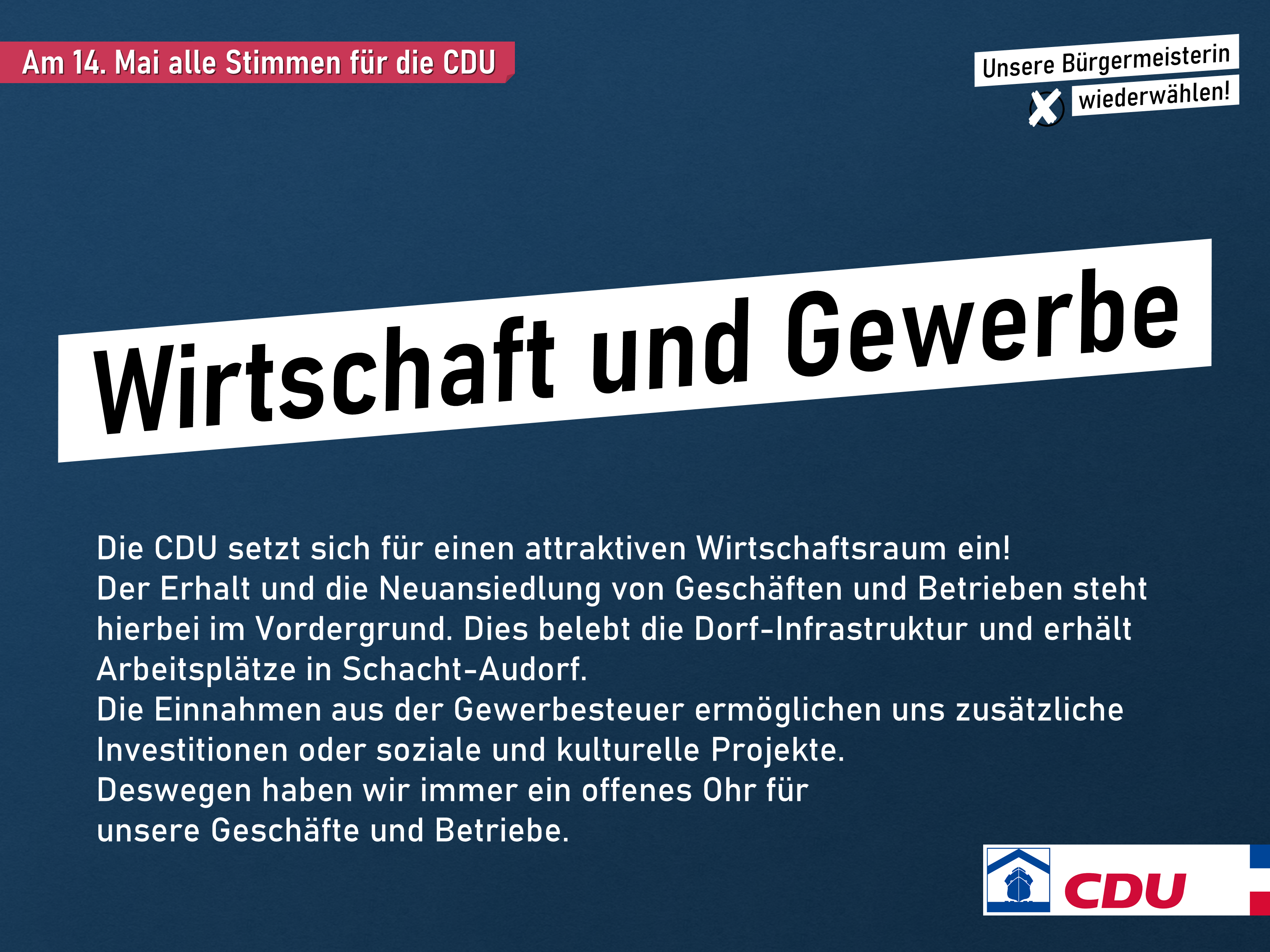 Die CDU begrüßt die Ansiedlung weiterer Betriebe. Die Schaffung von interessanten neuen Arbeitsplätzen ist wichtig für unsere Zukunft. Die Einnahme von Gewerbesteuer ermöglicht uns zusätzliche Investitionen oder soziale und kulturelle Projekte. Das gemeinsame Gewerbegebiet Borgstedtfelde geht derzeit in die Vermarktung und läuft erfolgsversprechend. Einer möglichen Ausweitung steht die CDU positiv gegenüber.