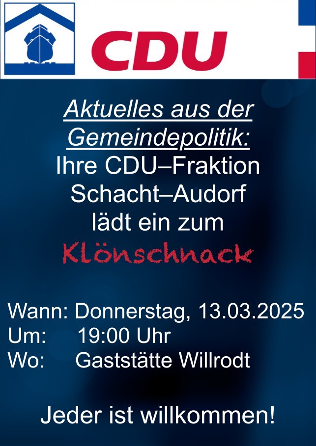 wir laden euch herzlich zum nächsten CDU-Klönschnack in der Gaststätte Willroth ein, um gemeinsam über aktuelle politische Themen zu diskutieren und unsere Ideen auszutauschen.